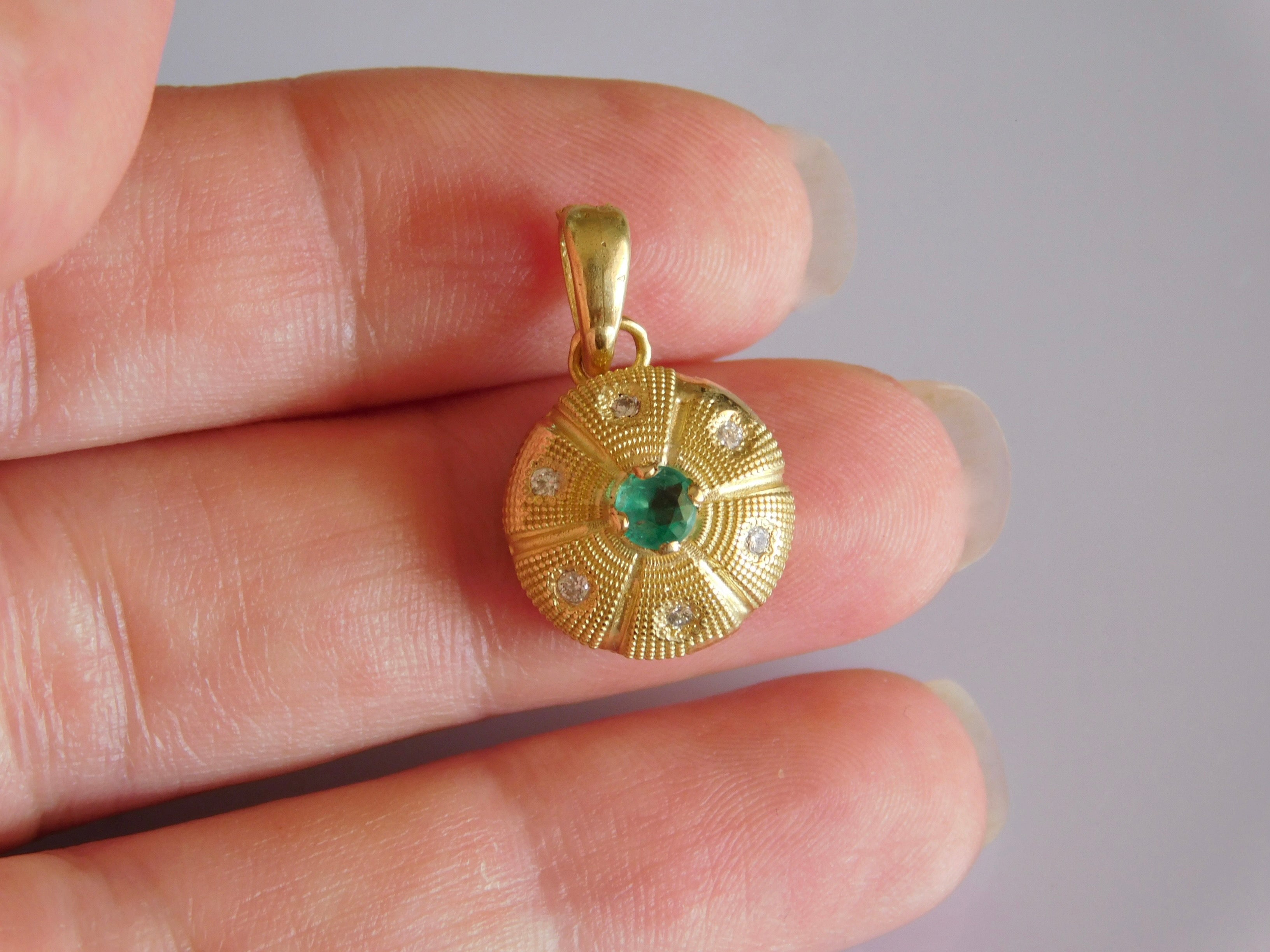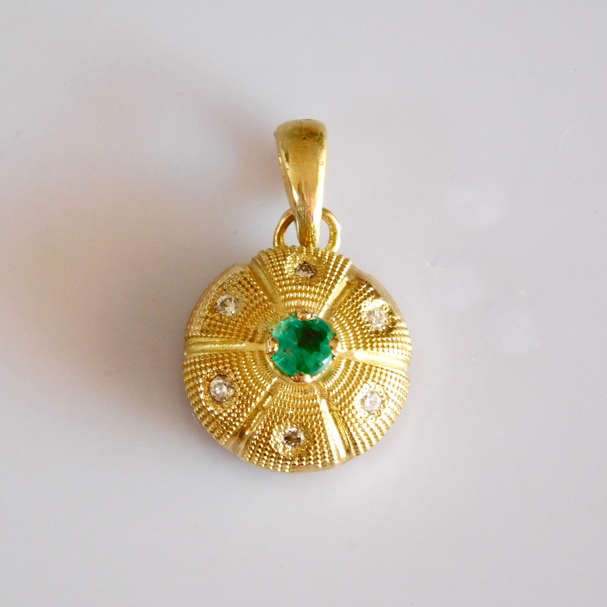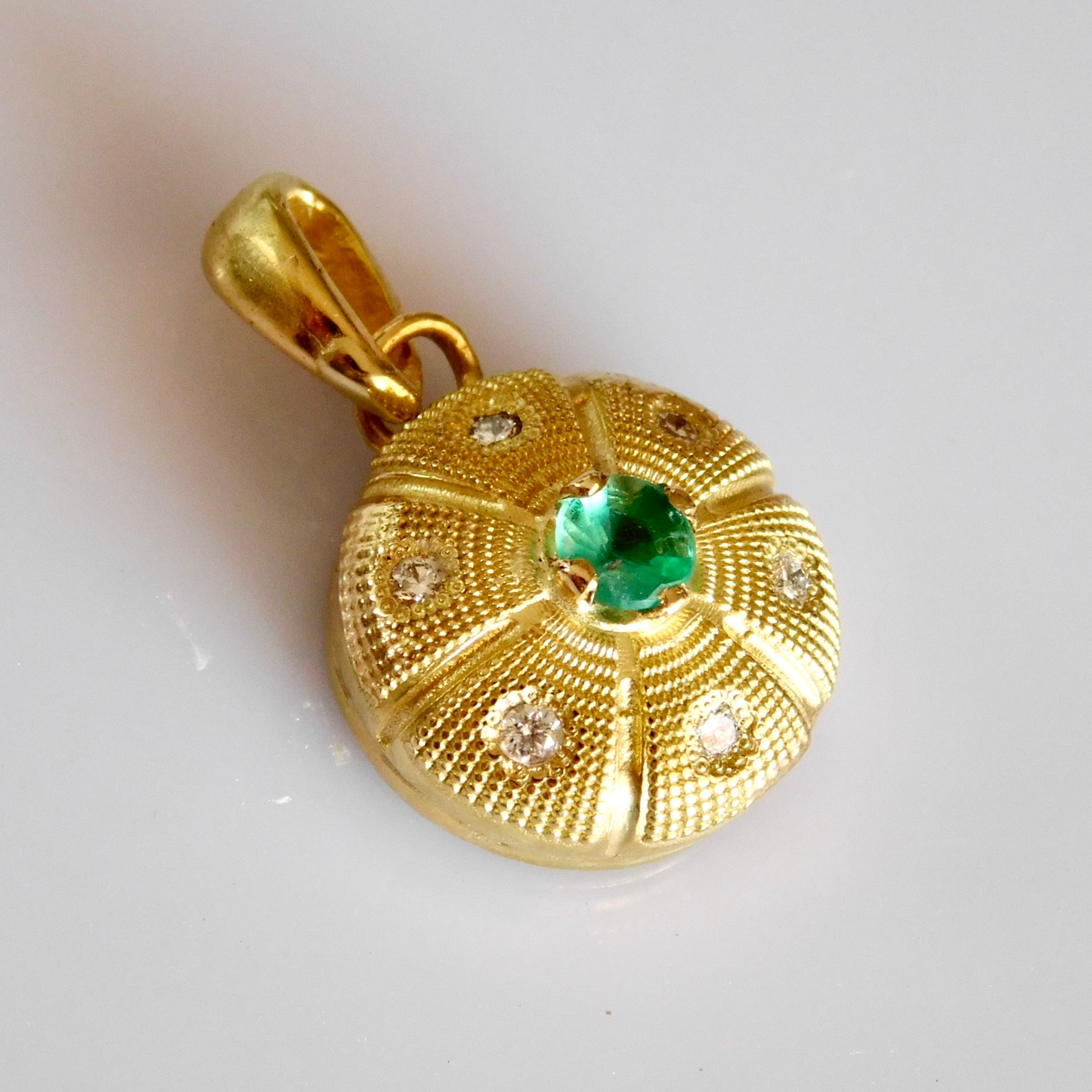 Discover the mystique of the MYSTIC PEYOTE Emerald Pendant. Crafted from 4.3g of 18k solid gold, this pendant features an intricate peyote cactus design intertwined with the Flower of Life symbol. At its center is a stunning 3mm natural untreated Colombian emerald, surrounded by six brilliant 0.01ct SI quality ethically sourced diamonds. Measuring 2 x 1.5 x 0.7 cm, this pendant is a symbol of both spiritual depth and luxury. The chain is sold separately. Enjoy free worldwide shipping to most countries. .