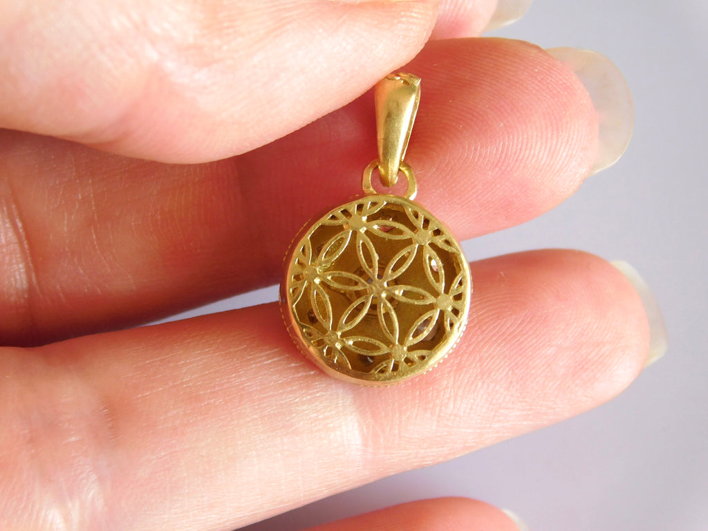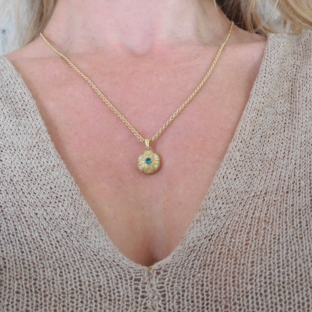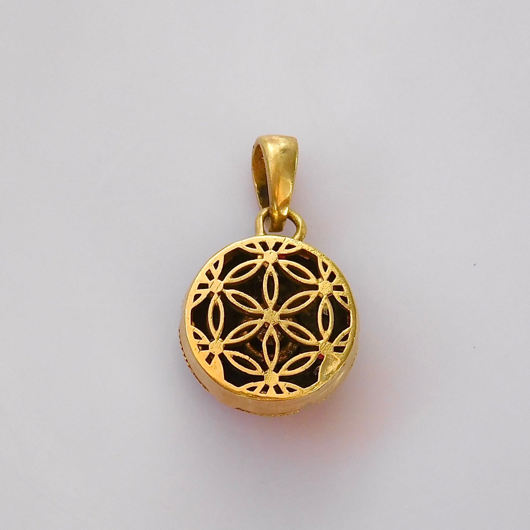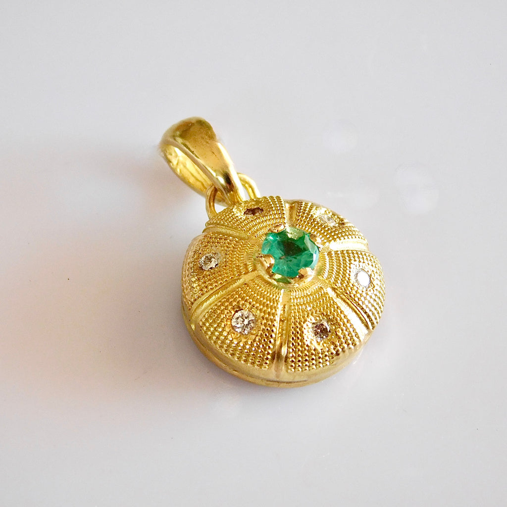Discover the mystique of the MYSTIC PEYOTE Emerald Pendant. Crafted from 4.3g of 18k solid gold, this pendant features an intricate peyote cactus design intertwined with the Flower of Life symbol. At its center is a stunning 3mm natural untreated Colombian emerald, surrounded by six brilliant 0.01ct SI quality ethically sourced diamonds. Measuring 2 x 1.5 x 0.7 cm, this pendant is a symbol of both spiritual depth and luxury. The chain is sold separately. Enjoy free worldwide shipping to most countries. .