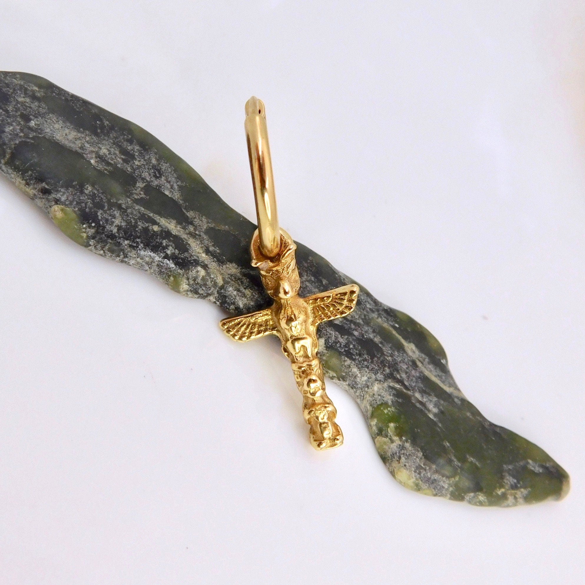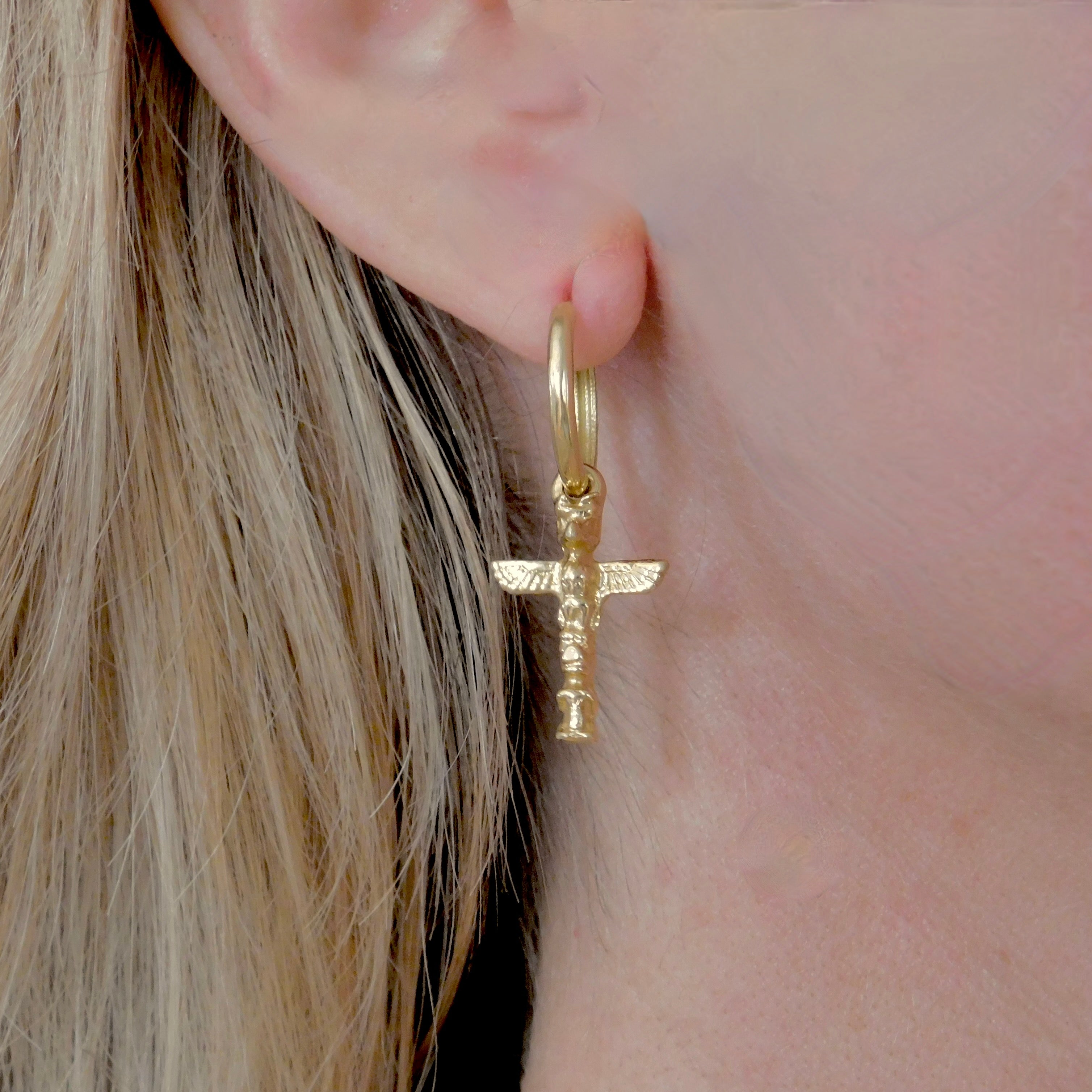 The Thunderbird Totem Hoop Earrings embody the powerful essence of inner fire and transformation. Known for its symbolism of leadership and strength, the Thunderbird represents a great messenger and a symbol of power. Crafted from 4.5g of solid gold, these earrings feature a 1.5cm hoop with a totem length of 1.5 x 2 cm.